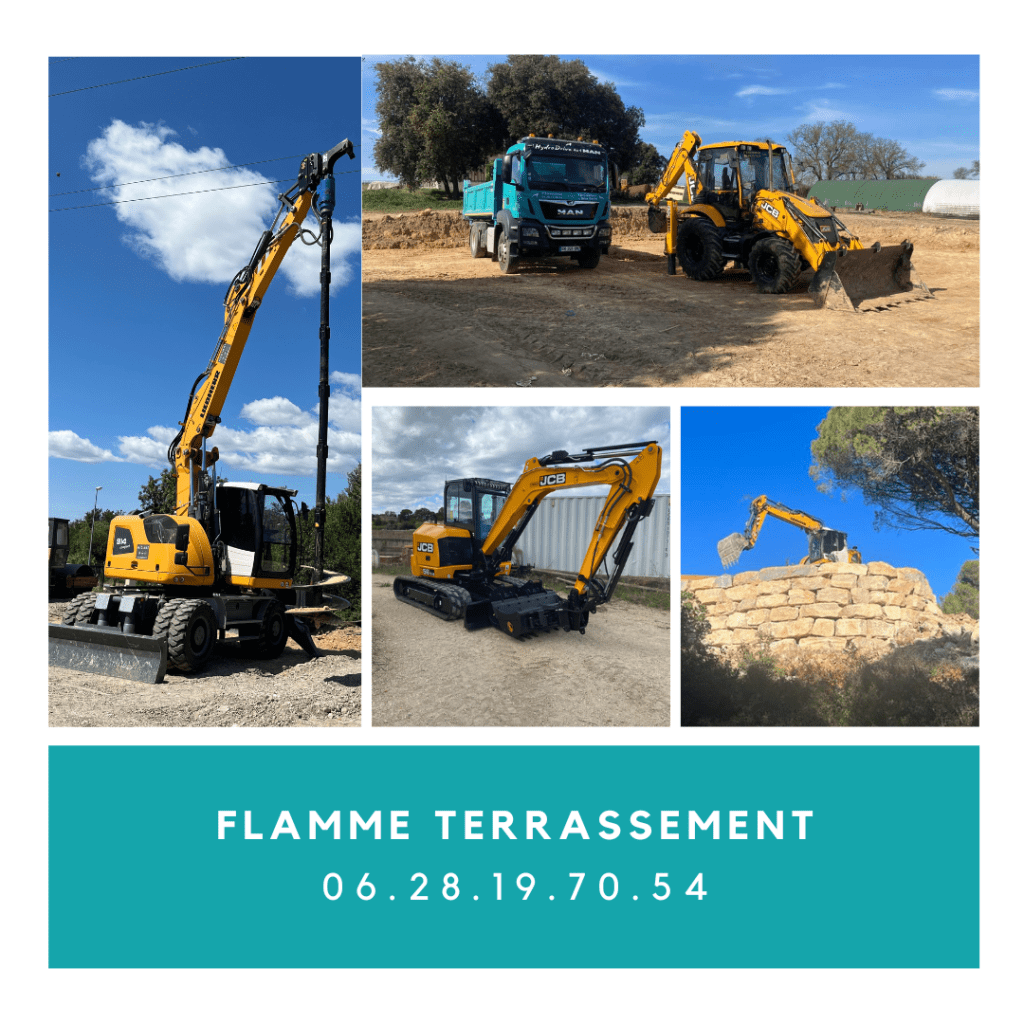 La société FLAMME TERRASSEMENT assure, dans la région de Nîmes, mais aussi dans tous le département du Gard et des départements limitrophes, tous les travaux de terrassement et d’aménagement liés à la construction : décaissement, fondations, terrassement de piscine, nettoyage de parcelle, élimination des végétaux, démolition, viabilisation, enrochement…